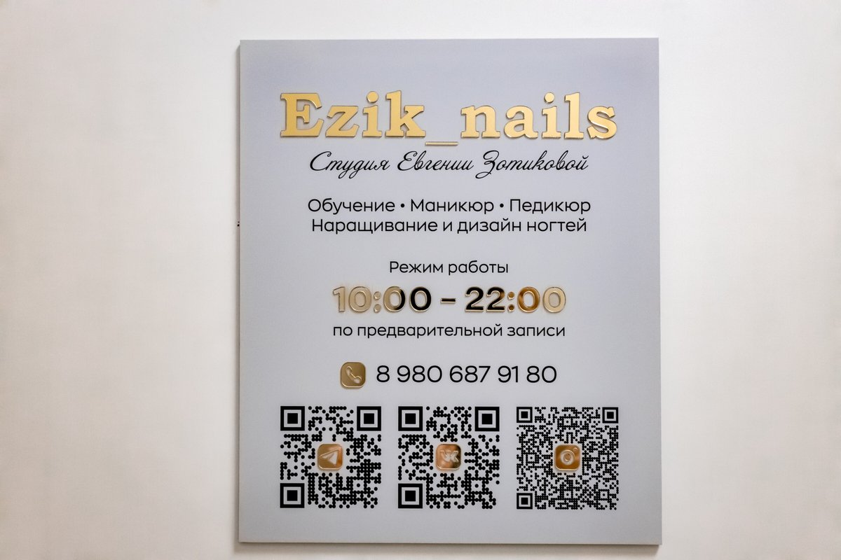 Вам все еще кажется, что салоны красоты - роскошь и лишняя трата денег? Приходите в студию маникюра Ezik_nails и убедитесь в обратном! Безупречный профессионализм наших мастеров ногтевого сервиса не только гарантирует вам уровень ухода, которого невозможно добиться в домашних условиях, но и даст шанс по-настоящему преобразиться, найдя для себя новый стиль. В салонной атмосфере вы отдохнете душой и телом, испытав тот роскошный уровень заботы, который никого не оставит равнодушным!